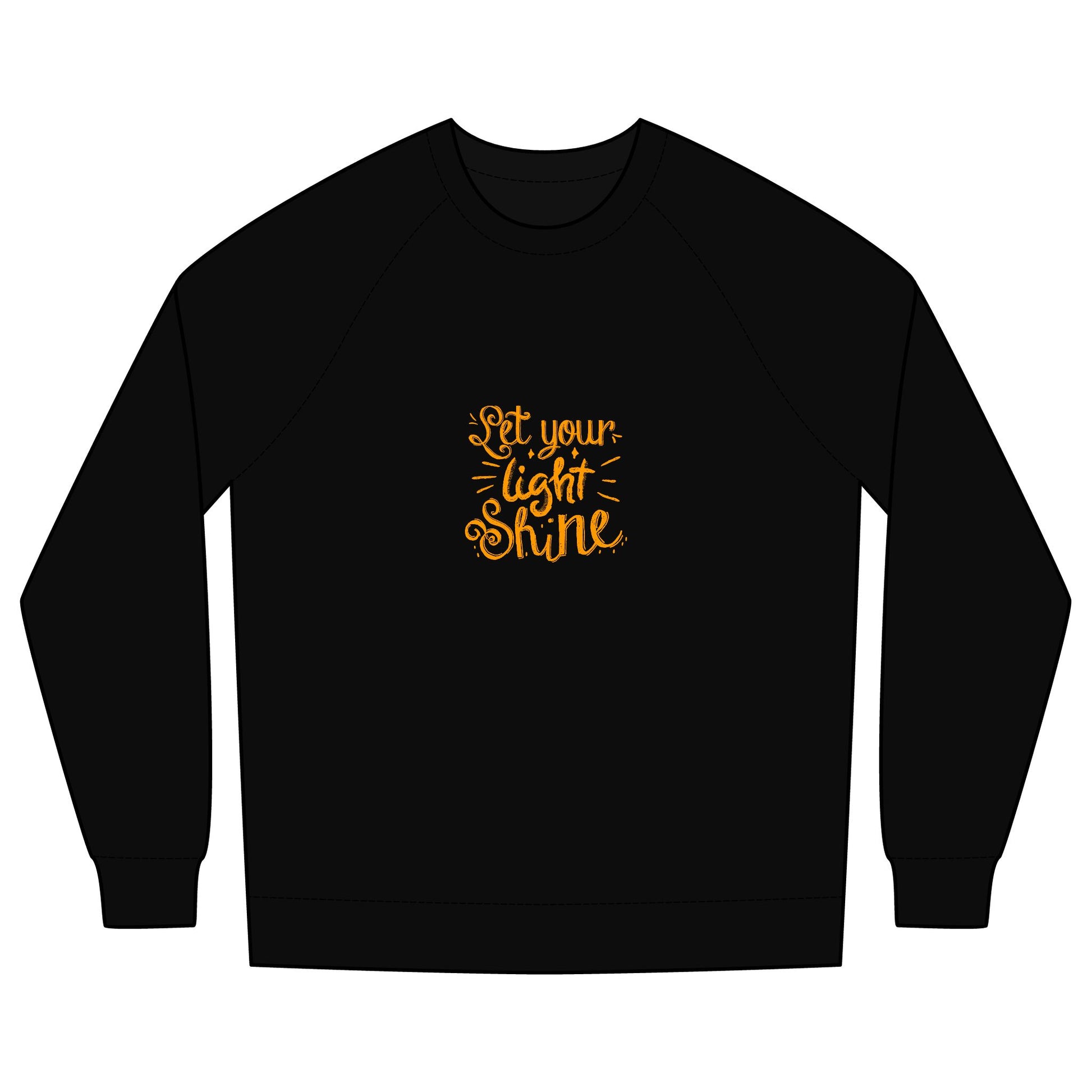 A soft, midweight crew sweatshirt with raglan sleeves and a gentle hand. Centered on the chest is a warm, hand-lettered design that reads “Let your light shine” in golden tones — subtle, uplifting, and effortless. The ribbed lay-flat collar and 1x1 stretch cuffs move with you and bounce back for a lived-in fit. The cotton-rich anti-pill fleece feels cozy against the skin while holding its shape through washes. Wear it layered over a tee for chilly mornings or alone on quiet evenings when you want something that feels both comforting and quietly inspiring.