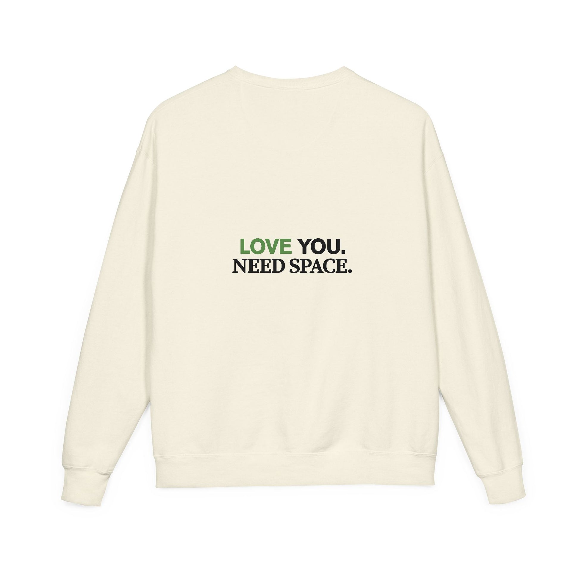 Soft, vintage-washed comfort with a quiet, honest message. This midweight crewneck arrives in a faded, natural tone with bold, two-line text—'LOVE YOU.' highlighted in green and 'NEED SPACE.' in stark black—centered on both front and back. Wear it on slow mornings, after long conversations, or when you want to show affection and boundaries at once. The garment-dyed finish and laid-flat ribbed collar create a lived-in look that pairs easily with jeans, leggings, or layered under a jacket. It feels like a familiar hug that also respects personal room—subtle, sincere, and calm.