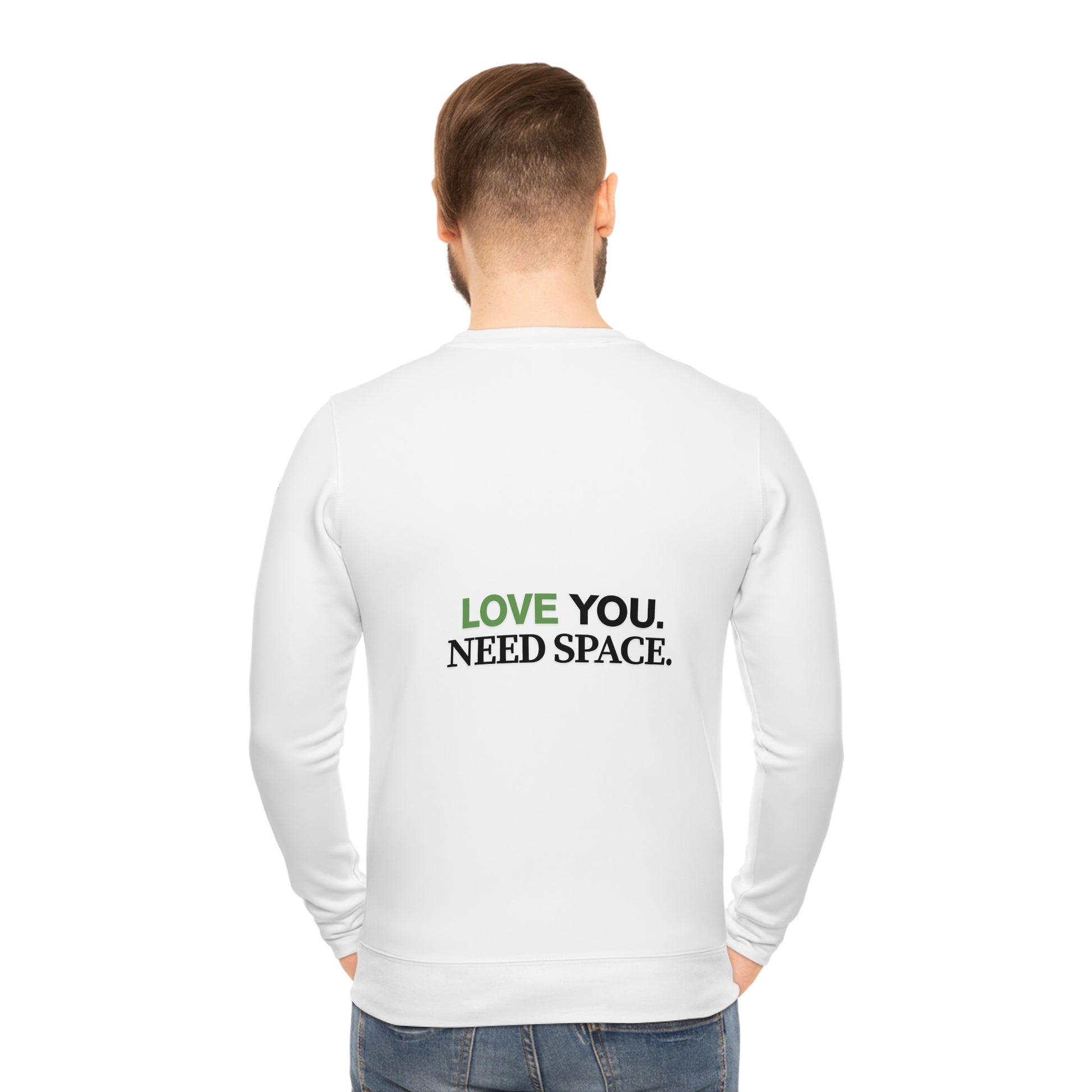Softly bold and quietly funny, this lightweight sweatshirt speaks for you without shouting. The simple, two-line message — LOVE YOU. NEED SPACE. — sits centered on a clean white background in contrasting green and black, a little playful and a little honest. Wear it on slow mornings when you want to stay cozy but keep boundaries, or toss it over jeans for a relaxed afternoon of errands and solo coffee. The fit is relaxed enough to layer, with a classic round neckline that keeps the silhouette easy and familiar. It’s the kind of sweatshirt that starts conversations and gives you the gentle buffer you want when you need it.