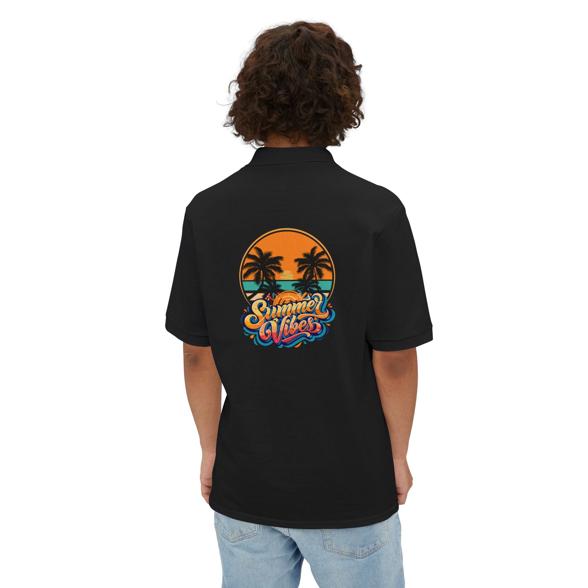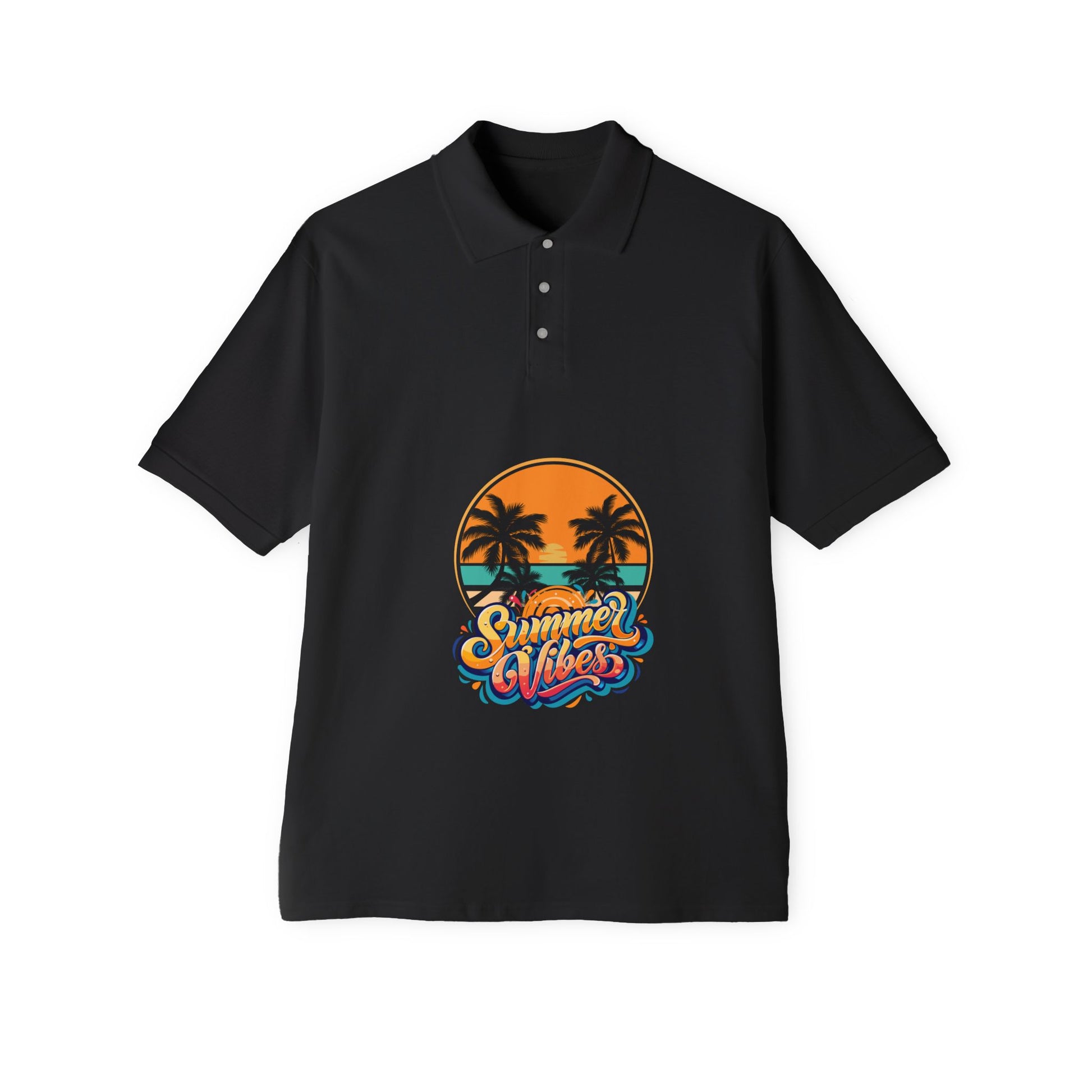 A clean, classic polo built for warm days and easygoing afternoons. The textured piqué knit breathes and holds its shape, while the welt collar and 3-button placket keep the look crisp. A sun-drenched retro graphic—palm silhouettes against an orange sunset with hand-lettered “Summer Vibes”—sits thoughtfully on chest and back, bringing a laid-back shoreline mood to the shirt. It layers under a light jacket or stands alone with shorts by the boardwalk. Comfortable, slightly structured, and quietly vintage — this polo carries the hush of late-day heat, cold drinks, and slow conversations on the porch.