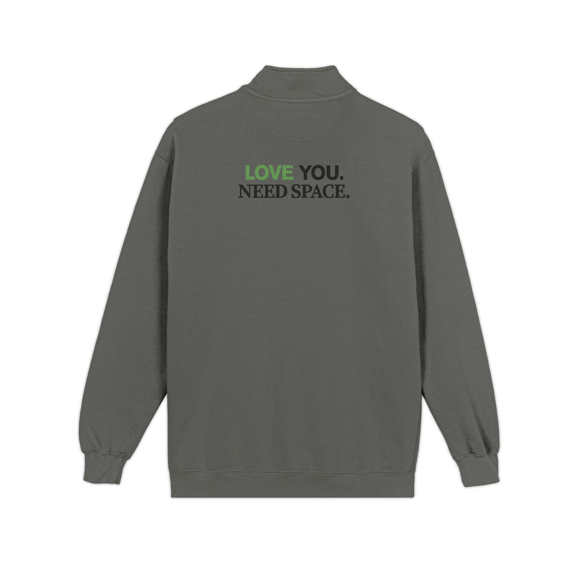 Slide this quarter-zip on when you want something that feels calm, steady, and a little wry. The muted classic colors whisper simplicity, while the bold back text—"LOVE YOU. NEED SPACE."—says exactly what needs saying without drama. It wears like a chilled afternoon: roomy at the body, snug at the cuffs, and warm enough for porch talks, late-night drives, or the slow, quiet hours at home. The heavier cotton blend and lined collar give it structure you can lean on; the relaxed fit and forward-rolled shoulders move when you do. This is for people who value comfort but keep their boundaries clear—gentle, honest, and low-key confident.