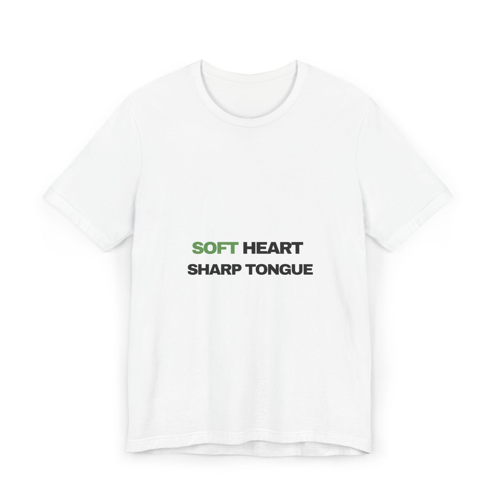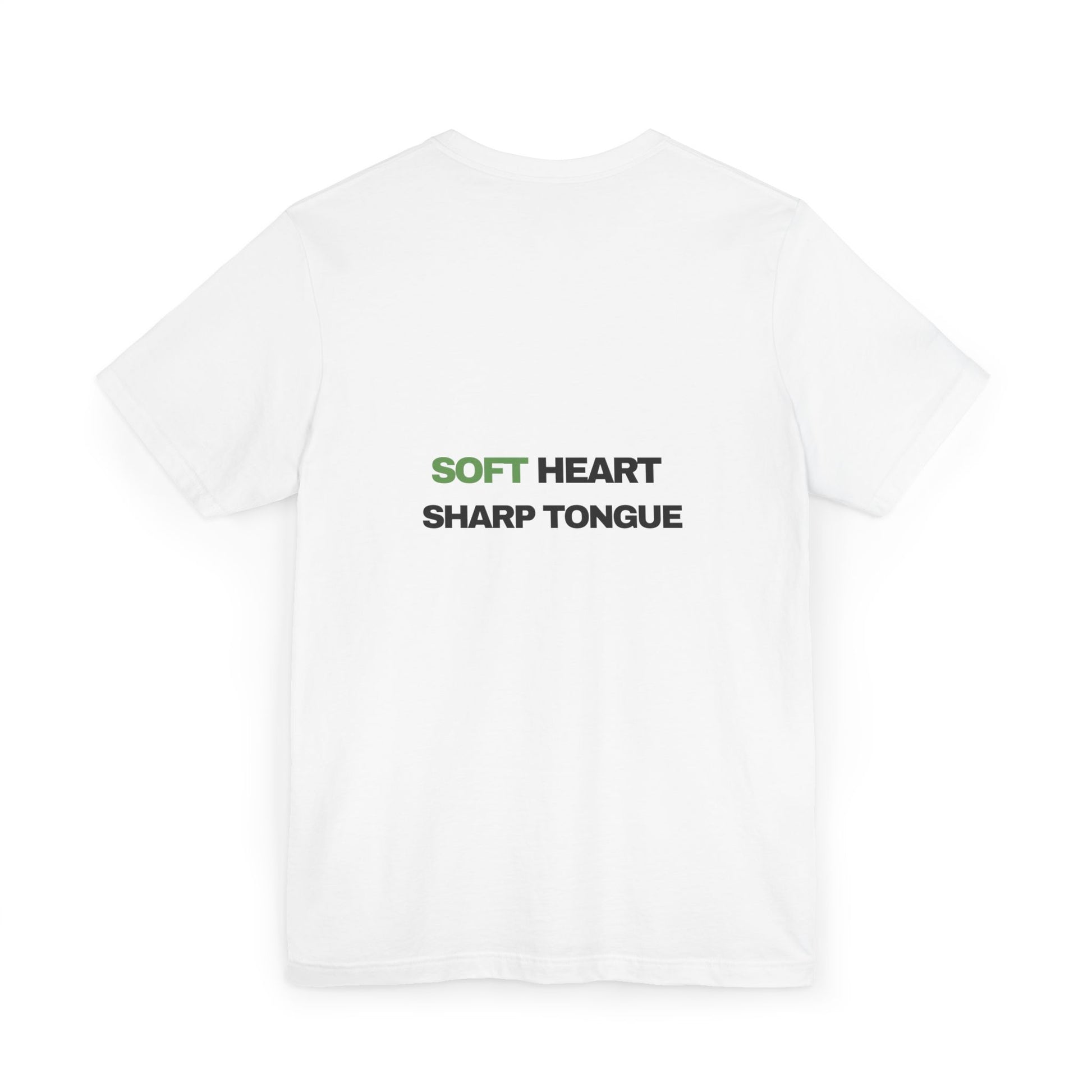 A lightweight, everyday tee that speaks with quiet confidence. The simple, centered text — “SOFT HEART” in muted green and “SHARP TONGUE” in black — gives this shirt subtle attitude without shouting. It settles softly on the shoulders and breathes easily through long summer days, layering under jackets or standing alone when you want your message to be unmistakable. Wear it to coffee runs, casual meetups, or moments when you need clothing that matches both warmth and honesty.