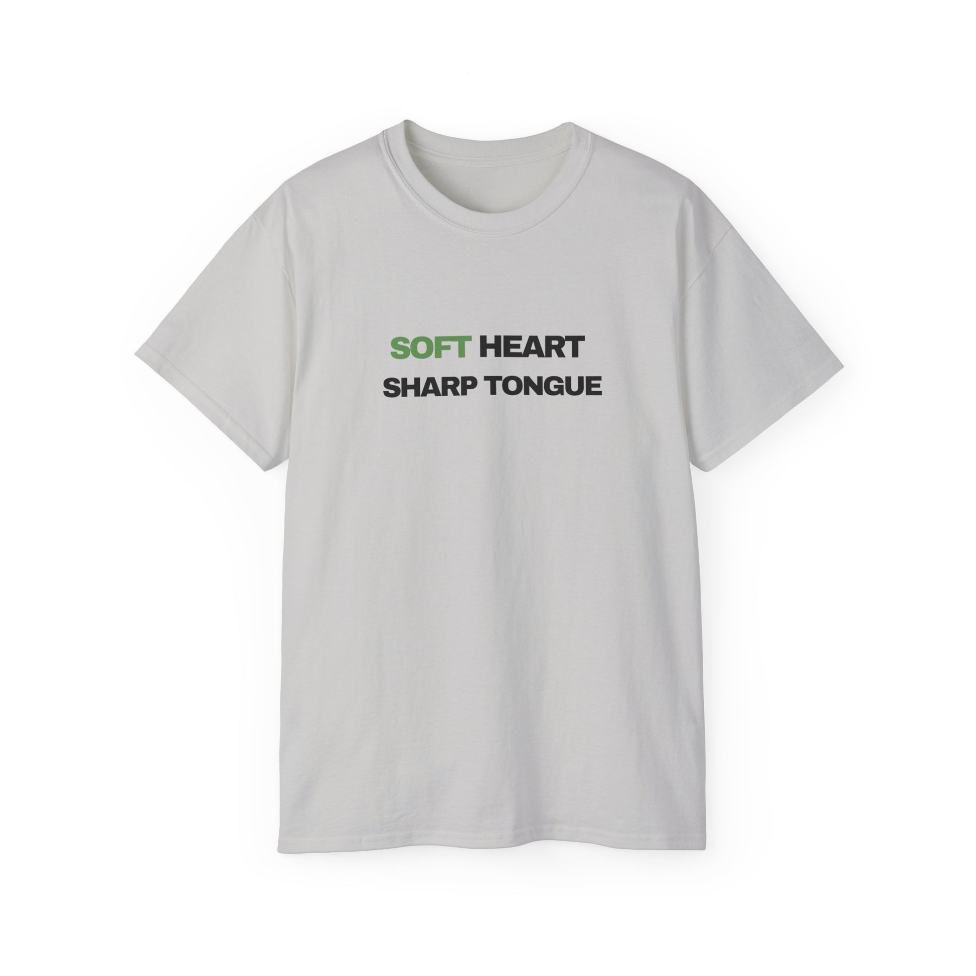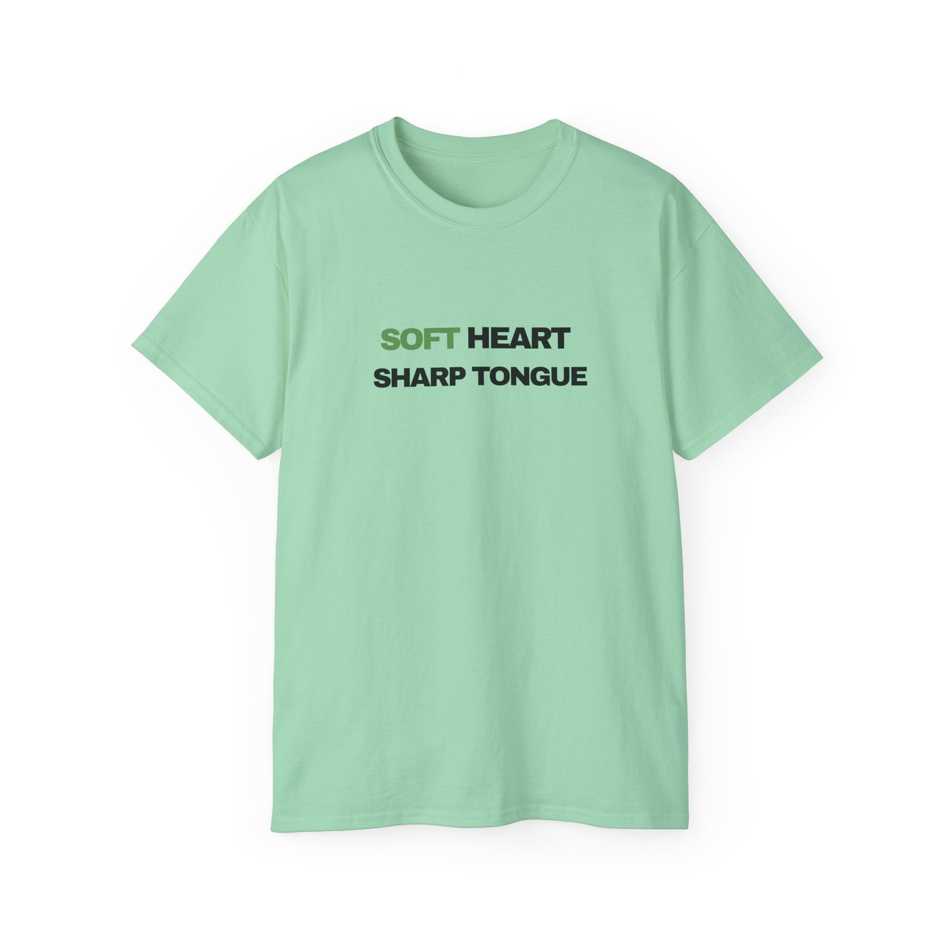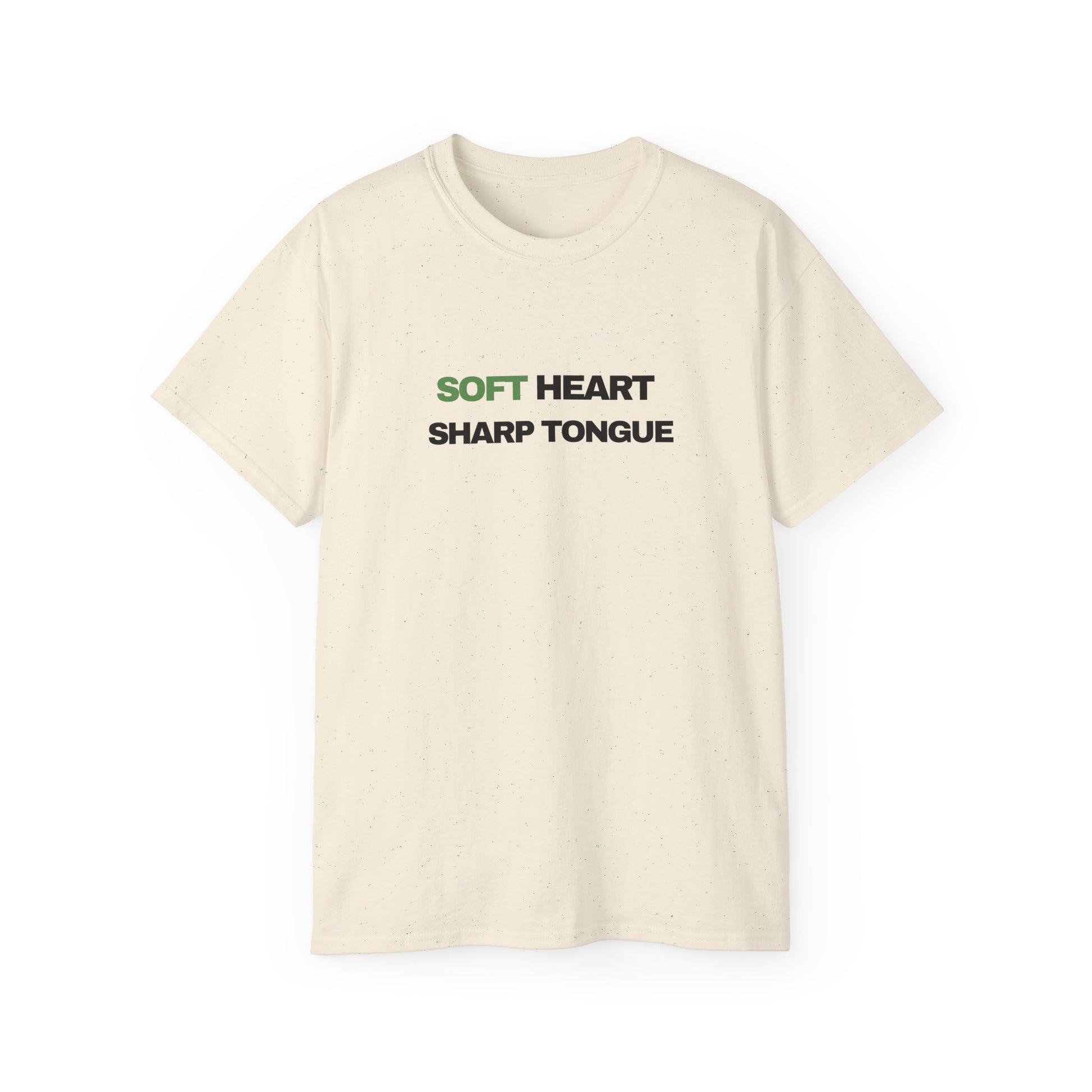 Soft Heart, Sharp Tongue—this tee speaks with calm confidence. Lightweight but substantial, the vintage-feel cotton sits just right against the skin while the clean, centered text makes a quiet statement. Wear it on slow mornings with coffee, at low-key meetups, or when you want your outfit to do the talking without raising the volume. The understated green accent on “SOFT” gives the design a subtle warmth; the bold black type beneath balances it with clarity. It slips easily into a capsule wardrobe and pairs naturally with worn denim, layered jackets, or a favorite cardigan—comfort that reads as composed and a little fierce all at once.