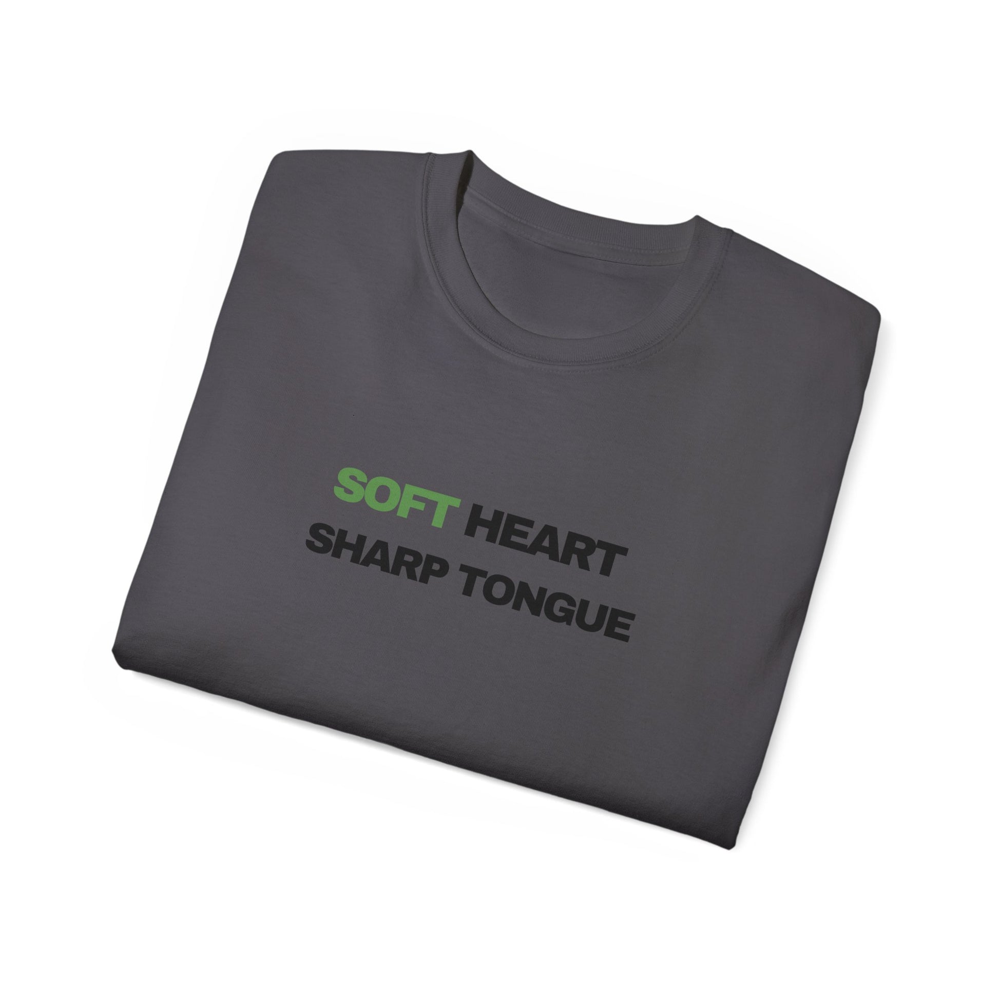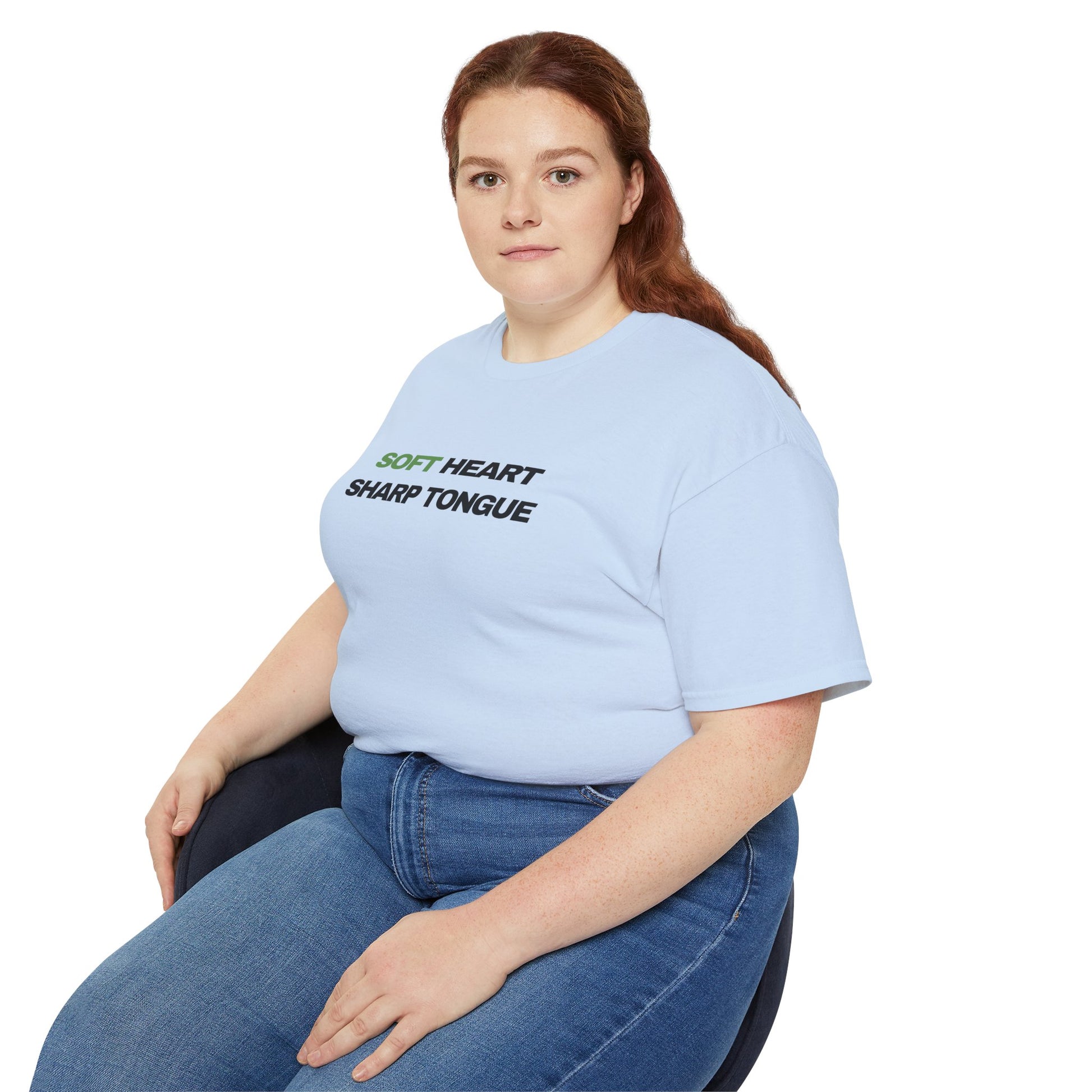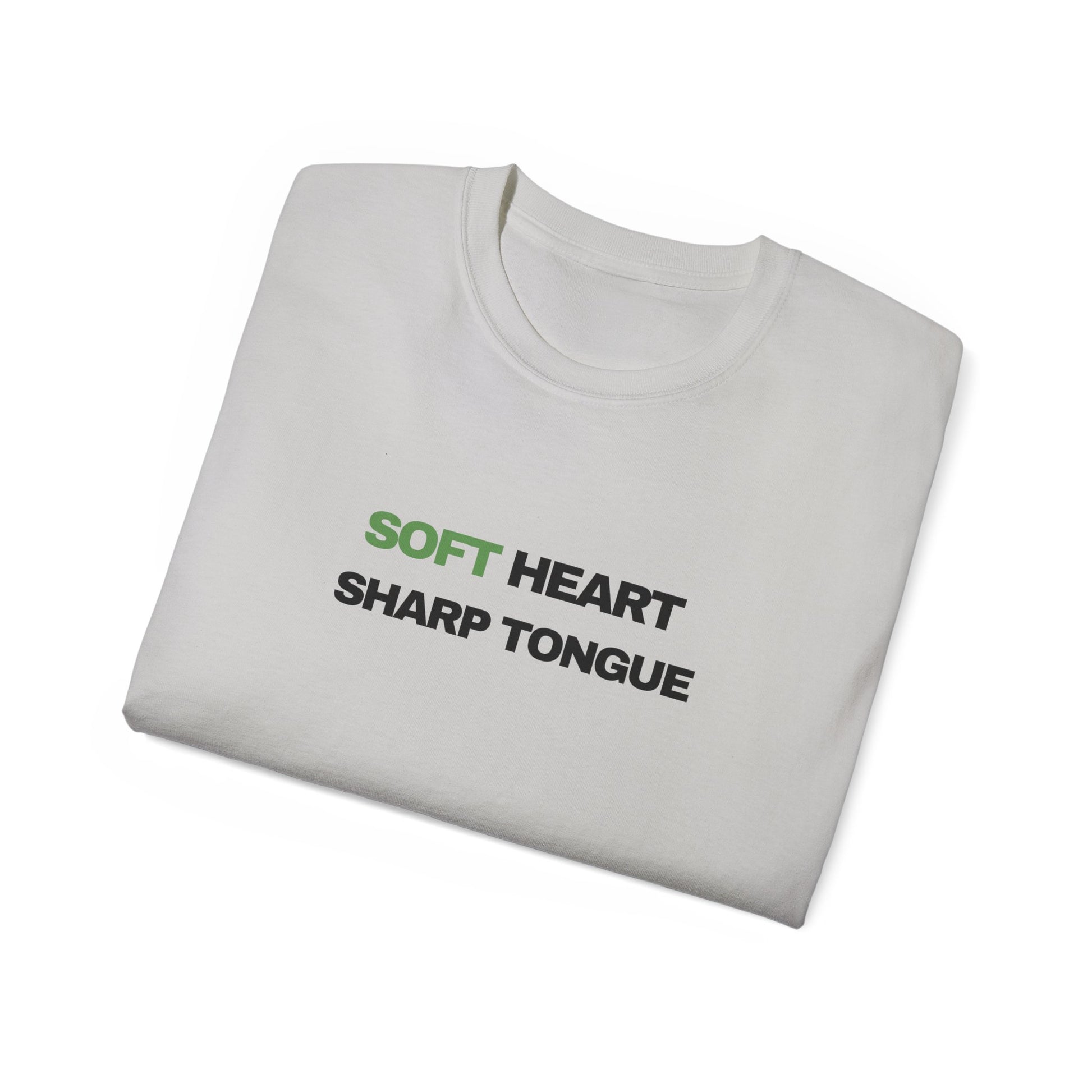 Soft Heart, Sharp Tongue—this tee speaks with calm confidence. Lightweight but substantial, the vintage-feel cotton sits just right against the skin while the clean, centered text makes a quiet statement. Wear it on slow mornings with coffee, at low-key meetups, or when you want your outfit to do the talking without raising the volume. The understated green accent on “SOFT” gives the design a subtle warmth; the bold black type beneath balances it with clarity. It slips easily into a capsule wardrobe and pairs naturally with worn denim, layered jackets, or a favorite cardigan—comfort that reads as composed and a little fierce all at once.
