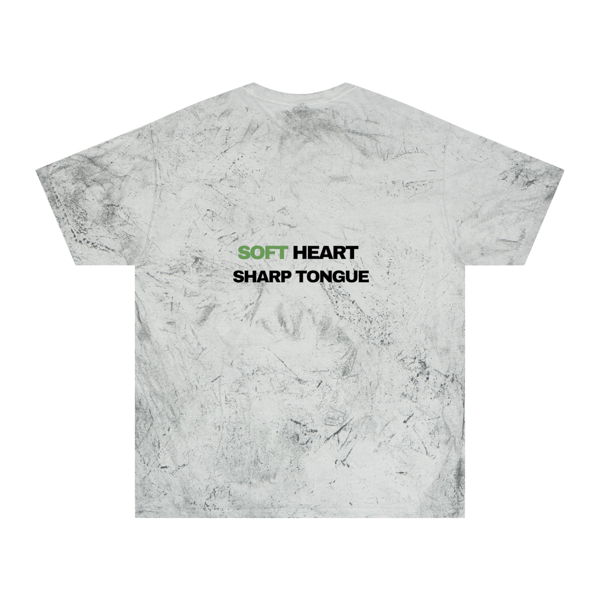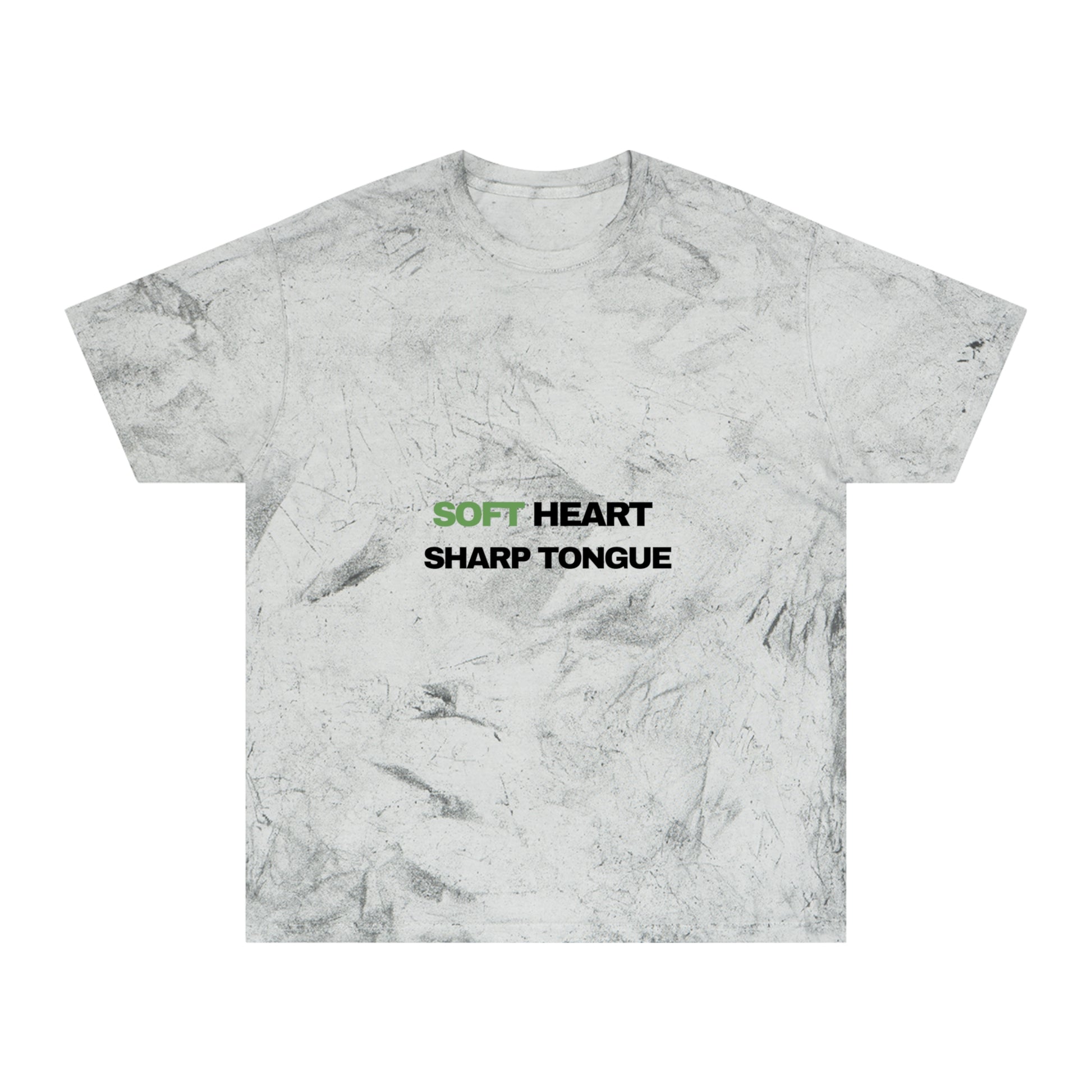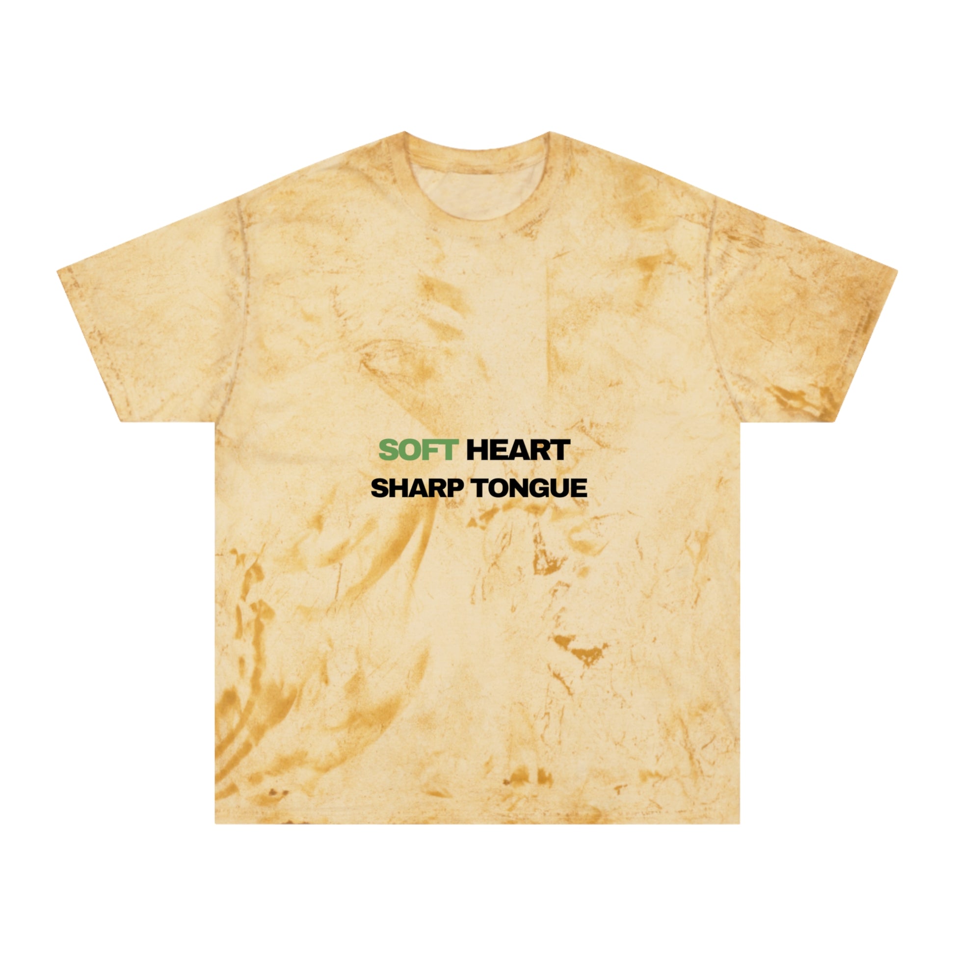 This relaxed-fit t-shirt feels lived-in from the first wear. The garment-dyed Color Blast creates one-of-a-kind marbling and vintage warmth in each piece, so yours will be uniquely yours. Centered text — soft green for “SOFT HEART” and bold black for “SHARP TONGUE” — reads like a quiet, confident declaration. Wear it when you want comfort without being invisible: layered over a cozy long-sleeve, paired with worn denim, or slipped on for a slow weekend coffee run. The medium-weight, ring-spun cotton holds print detail while draping softly across the body. Expect small, beautiful variations in color and texture that tell a story of handcrafted finish and casual edge.